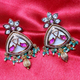 A blend of traditional charm and geometric elegance, these hexagon-shaped earrings feature intricate enamel detailing, floral petal motifs in vibrant pink, and a fringe of green beads and gold-toned drops.