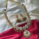 The Hiranya Mala Set is a brilliant, contemporary take on traditional Kundan jewelry. This matching necklace and earring set is designed to sit gracefully along the collarbone, providing continuous sparkle and modern elegance.